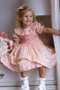 The hand-smocked bodice is exquisitely adorned with soft pink embroidery, showcasing the artistry of traditional craftsmanship. Whilst the ruffled collar and sleeves are framed with delicate frills for a touch of vintage romance.